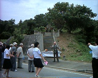 この日は沖縄県の休日です。 嘉津宇の慰霊塔に住民と上本部中学校の生徒達が集まりました。 平和教育の一環とのこと。 黙祷,焼香の後,中学生の代表が追悼の作文を読み上げました。 確かに,戦争を考えるいい機会だと思います。